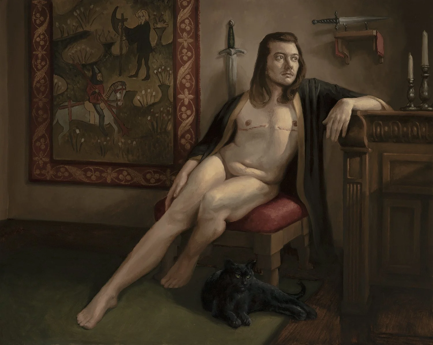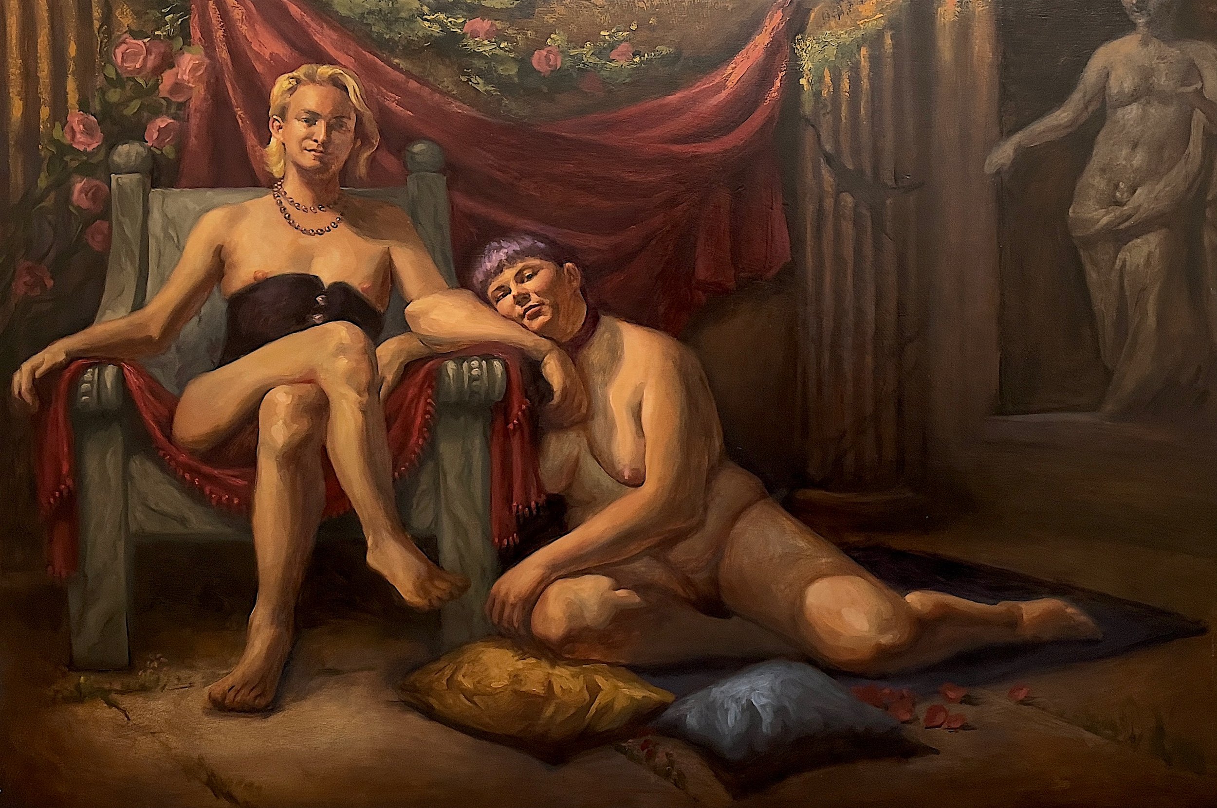 Within my paintings, I often undermine some aspect of heteronormativity within art historical traditions. It allows me to challenge the viewer’s preconceptions of gender expectations or presentations. It also allows me to fill a gap that has long excluded queer and trans individuals from the artistic conversation.What I am trying to portray challenges our cultural assumptions of what and who we usually see depicted in an academic style.